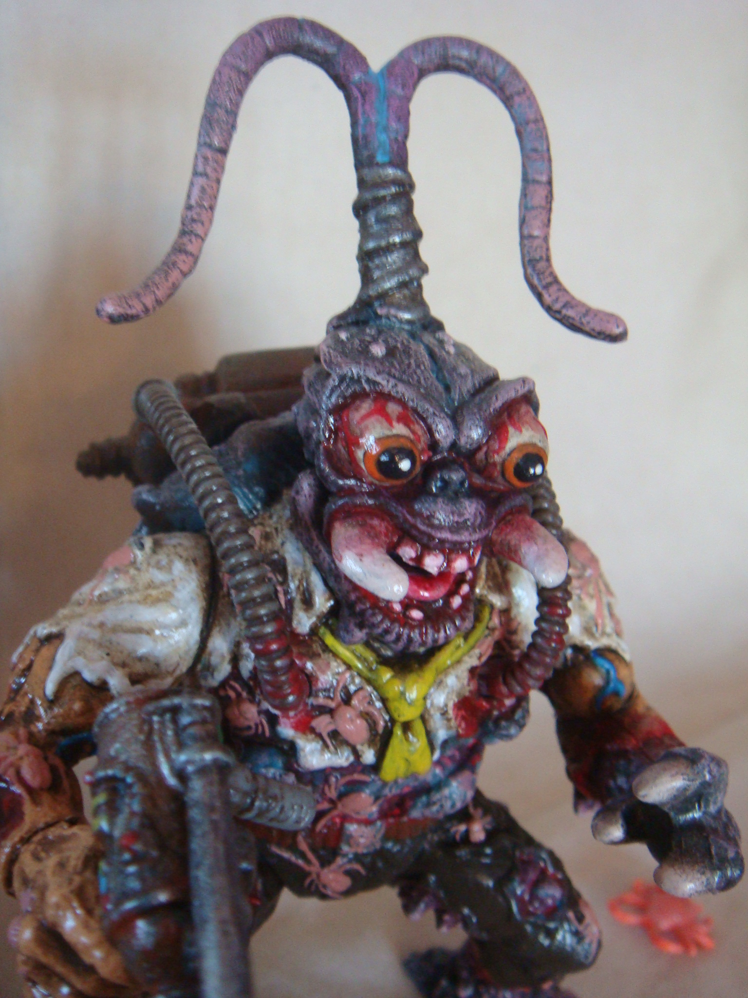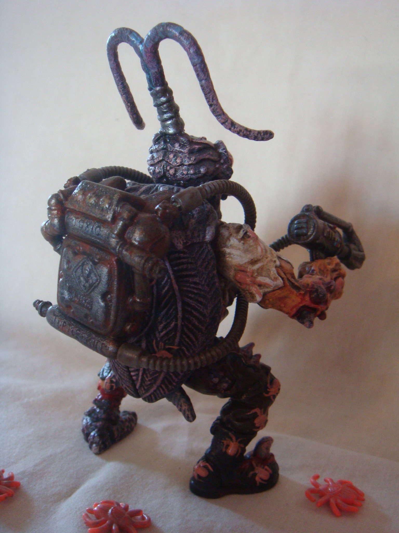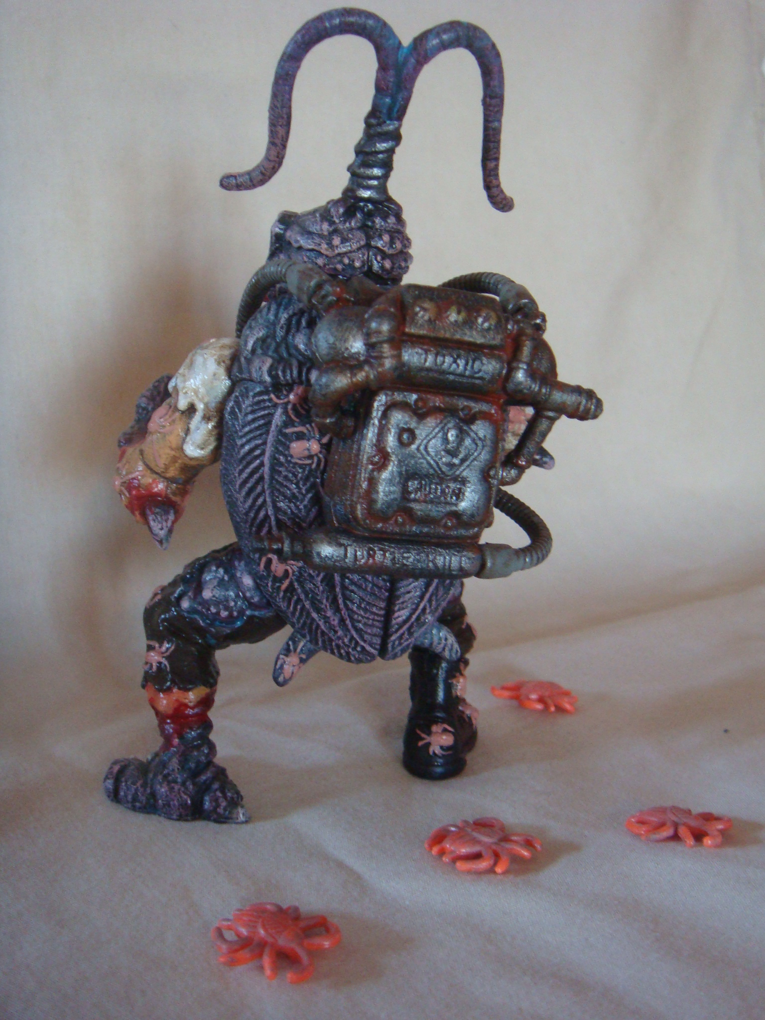 Armed with his poisonous pinchers and a tank full of Anti-Turtle Spray, this rude roach chews his way through almost anything. His power claw and bullet-proof shell make him a tough Turtlebustin' bug. And when the going gets rough, this roach gets other bugs to rally 'round him. Using his super-sensitive antennae as a telepathic link to insidious insects, Scumbug's the Pied Piper of the creepy and the crawly. You'll know when you're near his army- just listen for the crunch.