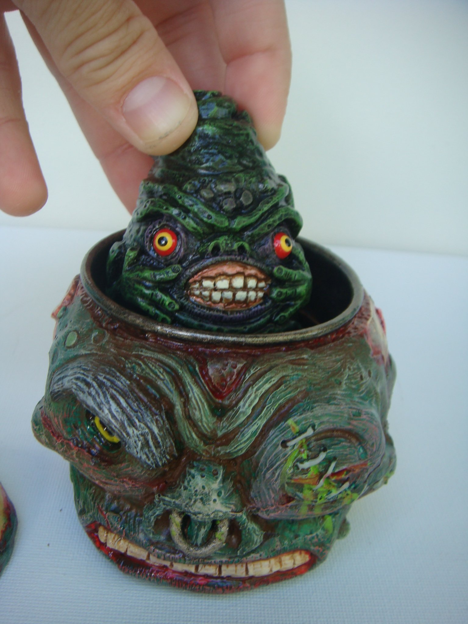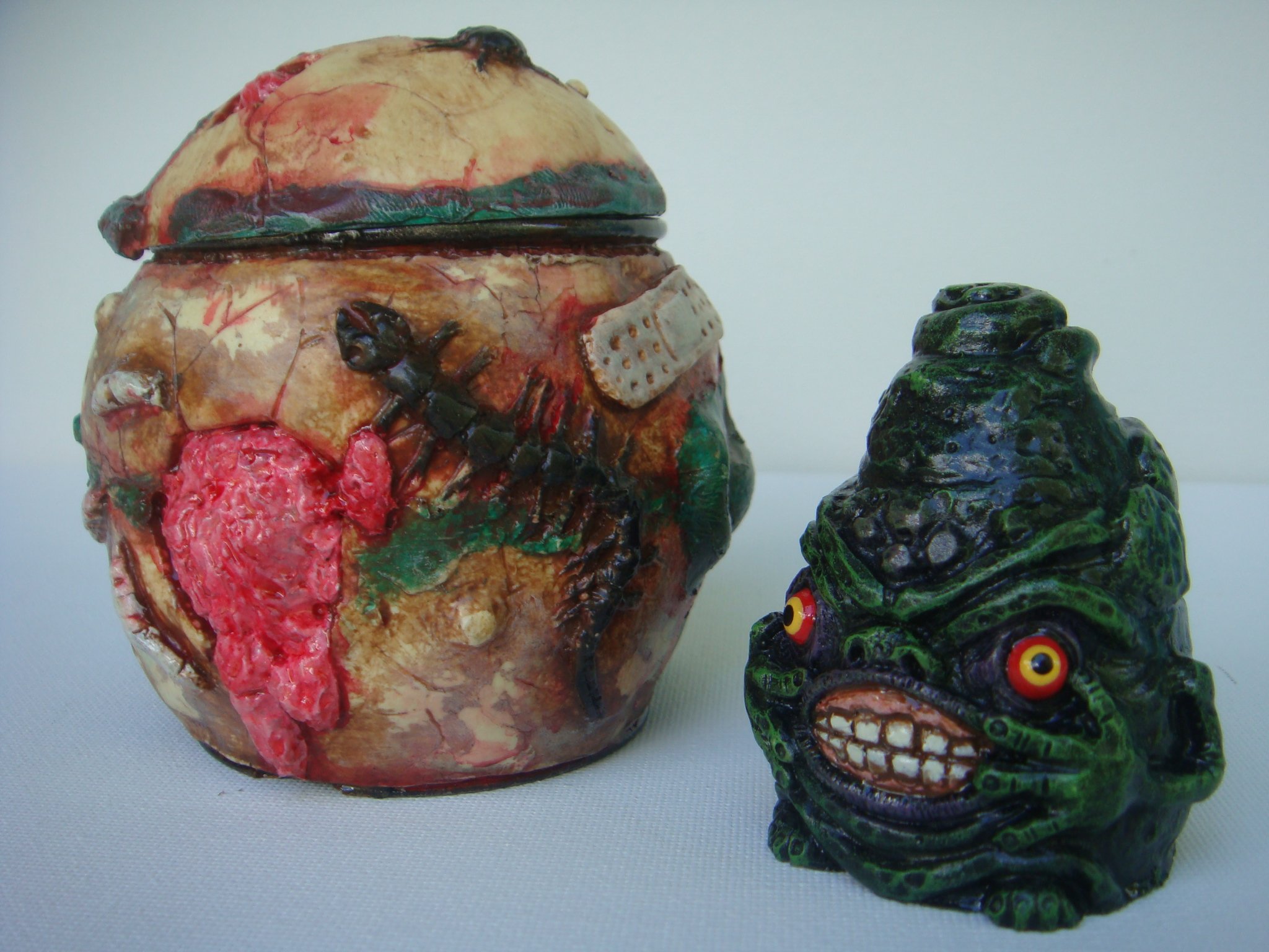 I grew up with Madballs, Garbage Pail Kids, Mad Scientist sets, and other nasty little toys that have influenced the art I choose to create. These are limited edition pieces which I will only cast and paint a few times a year when time allows, and each set comes with an oversized postcard featuring my original art with the set number and artist signature.