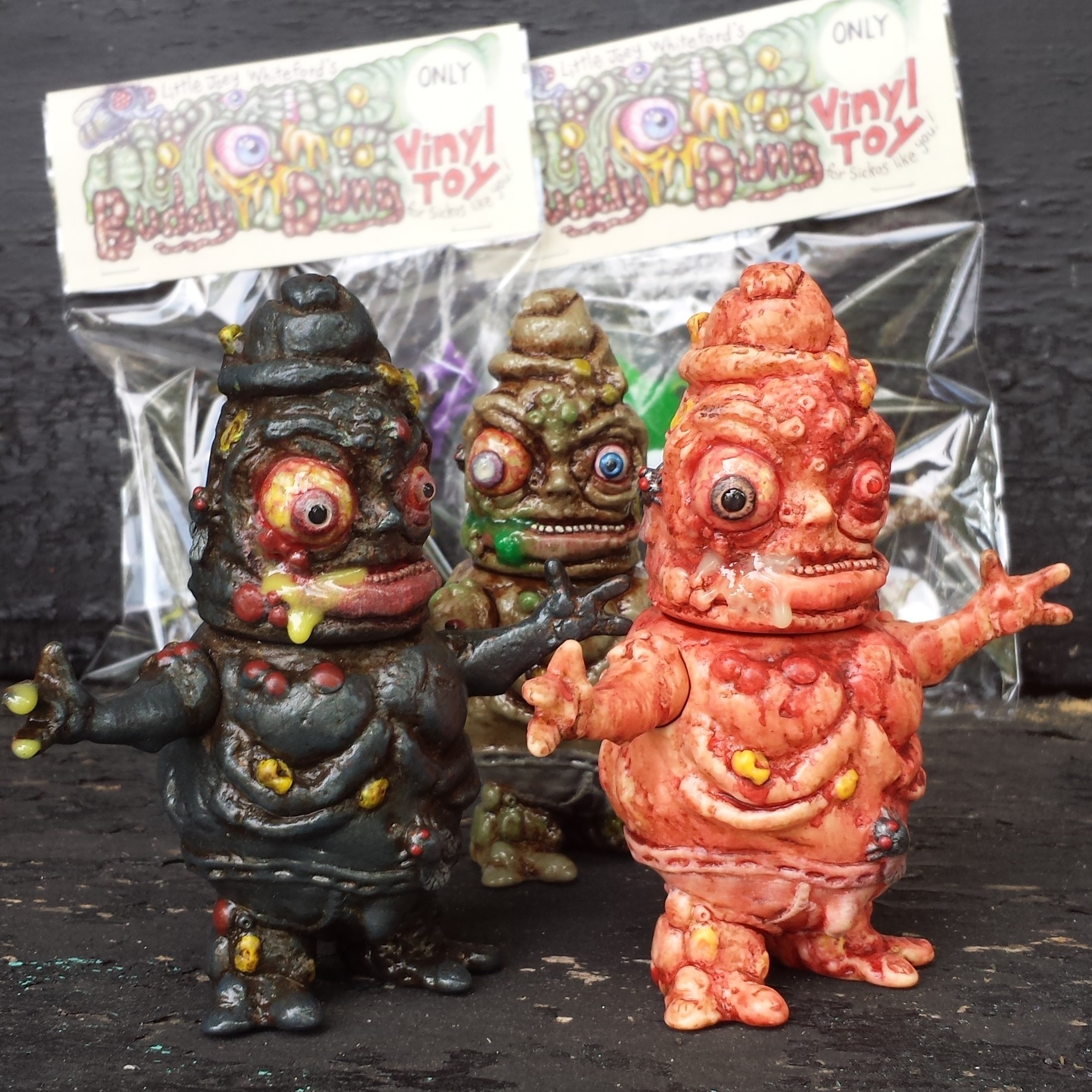 This is my Buddy Dung figure produced in Japanese Vinyl with paints and resin added by me. He comes bagged with header, along with stickers, button, and BrainWaves mini figure.