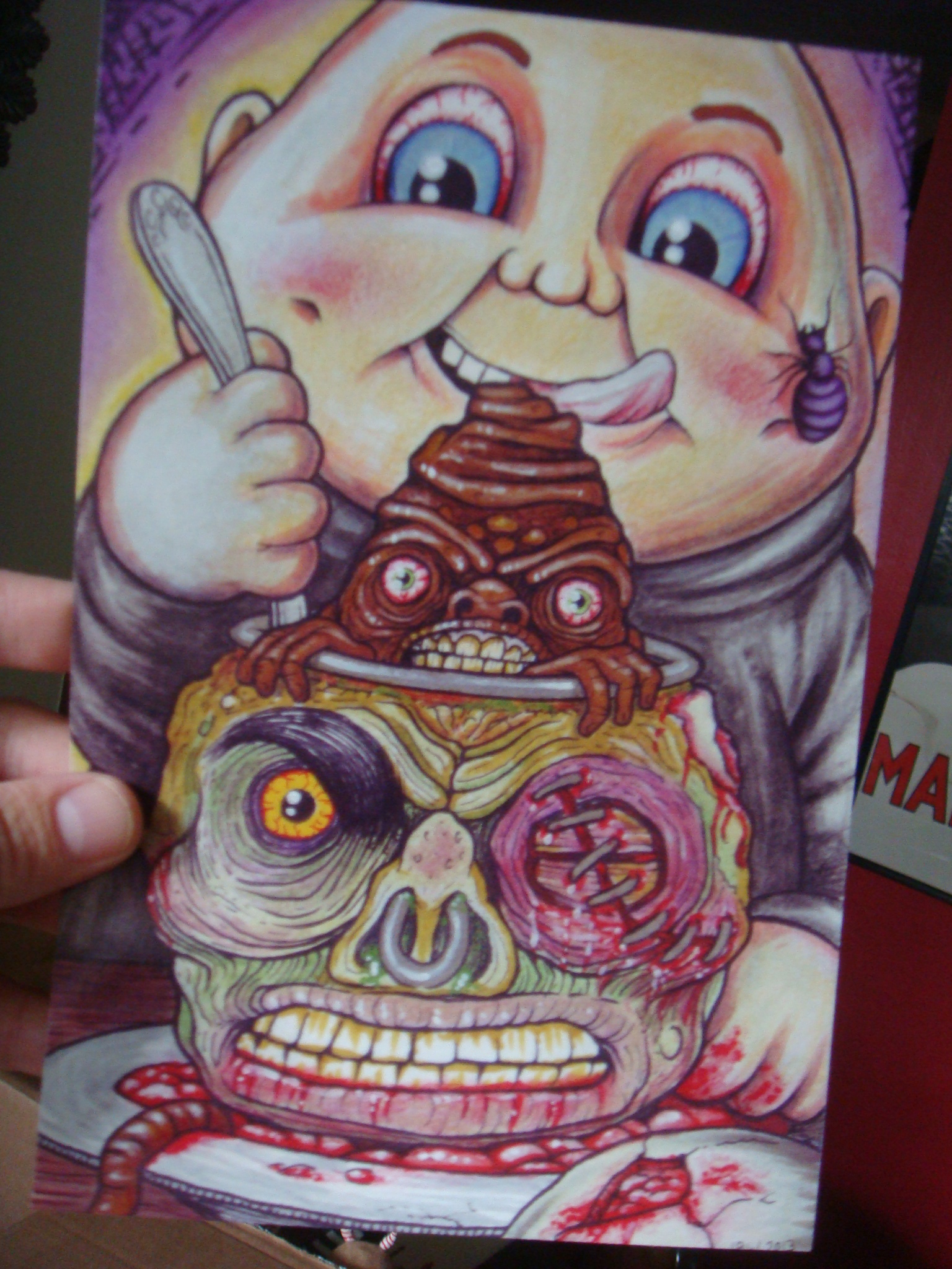 I grew up with Madballs, Garbage Pail Kids, Mad Scientist sets, and other nasty little toys that have influenced the art I choose to create. These are limited edition pieces which I will only cast and paint a few times a year when time allows, and each set comes with an oversized postcard featuring my original art with the set number and artist signature.