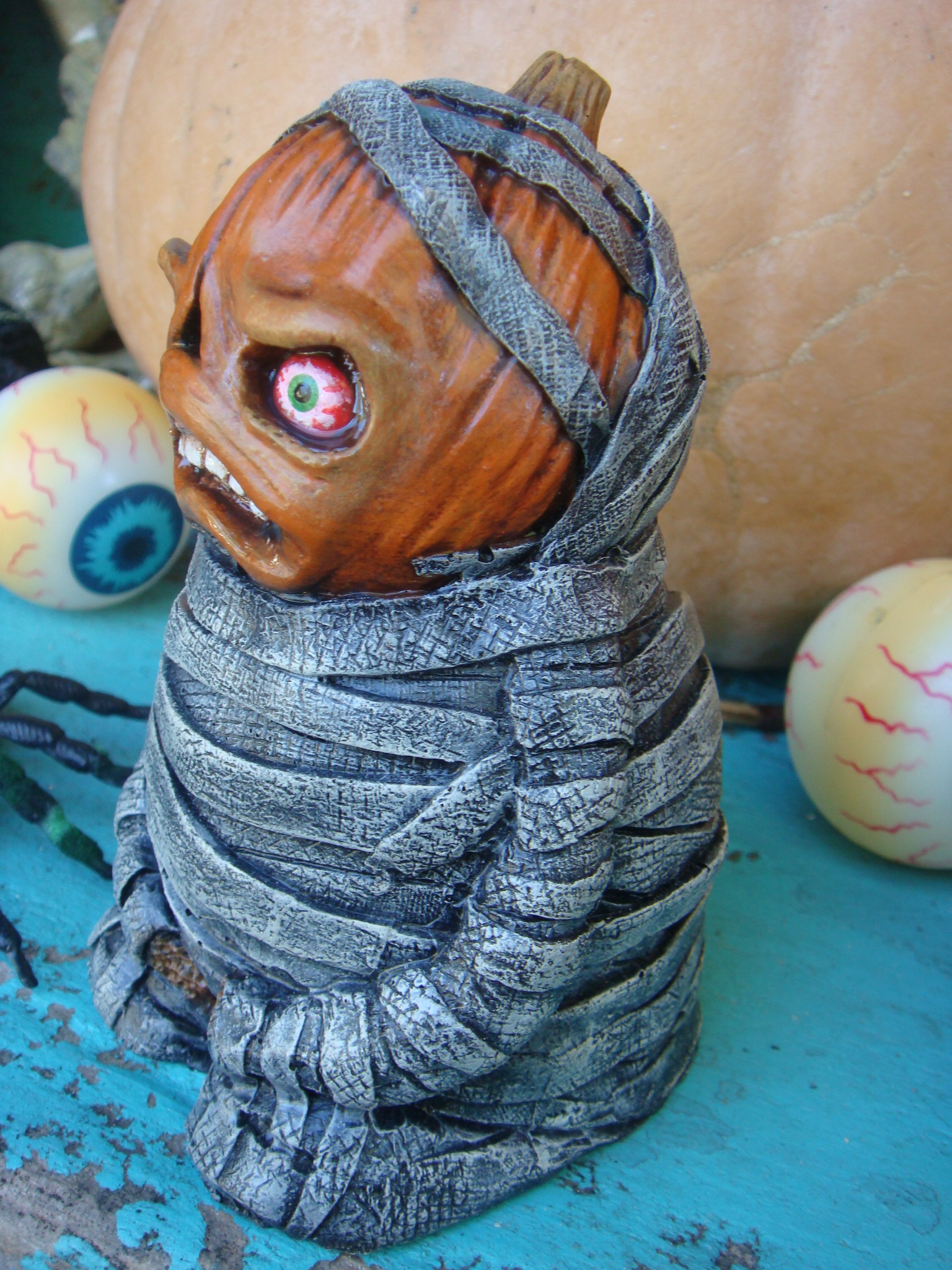 Standing at approximately 5 inches tall and just in time for Halloween, I present to you Mumpkin. For the year 2013, a limited run of these little guys will be made available, each cast from my original sculpt and with its own unique paint job. Part mummy, part pumpkin, part munchkin, and completely creepy and ready to find a home. Each figure comes with a custom made magnet featuring my original Mumpkin illustration. Thanks for checking out my work.