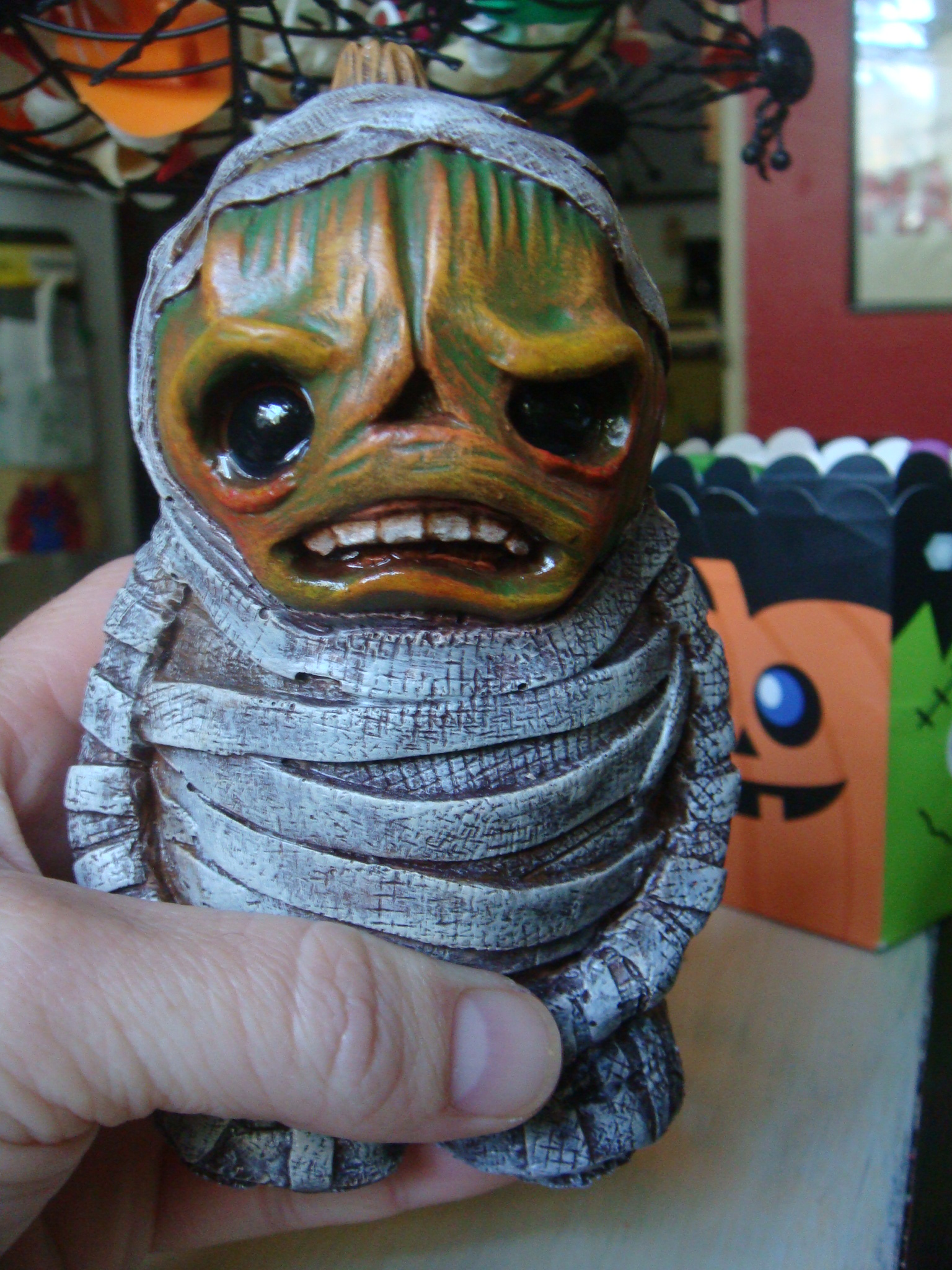 Standing at approximately 5 inches tall and just in time for Halloween, I present to you Mumpkin. For the year 2013, a limited run of these little guys will be made available, each cast from my original sculpt and with its own unique paint job. Part mummy, part pumpkin, part munchkin, and completely creepy and ready to find a home. Each figure comes with a custom made magnet featuring my original Mumpkin illustration. Thanks for checking out my work.