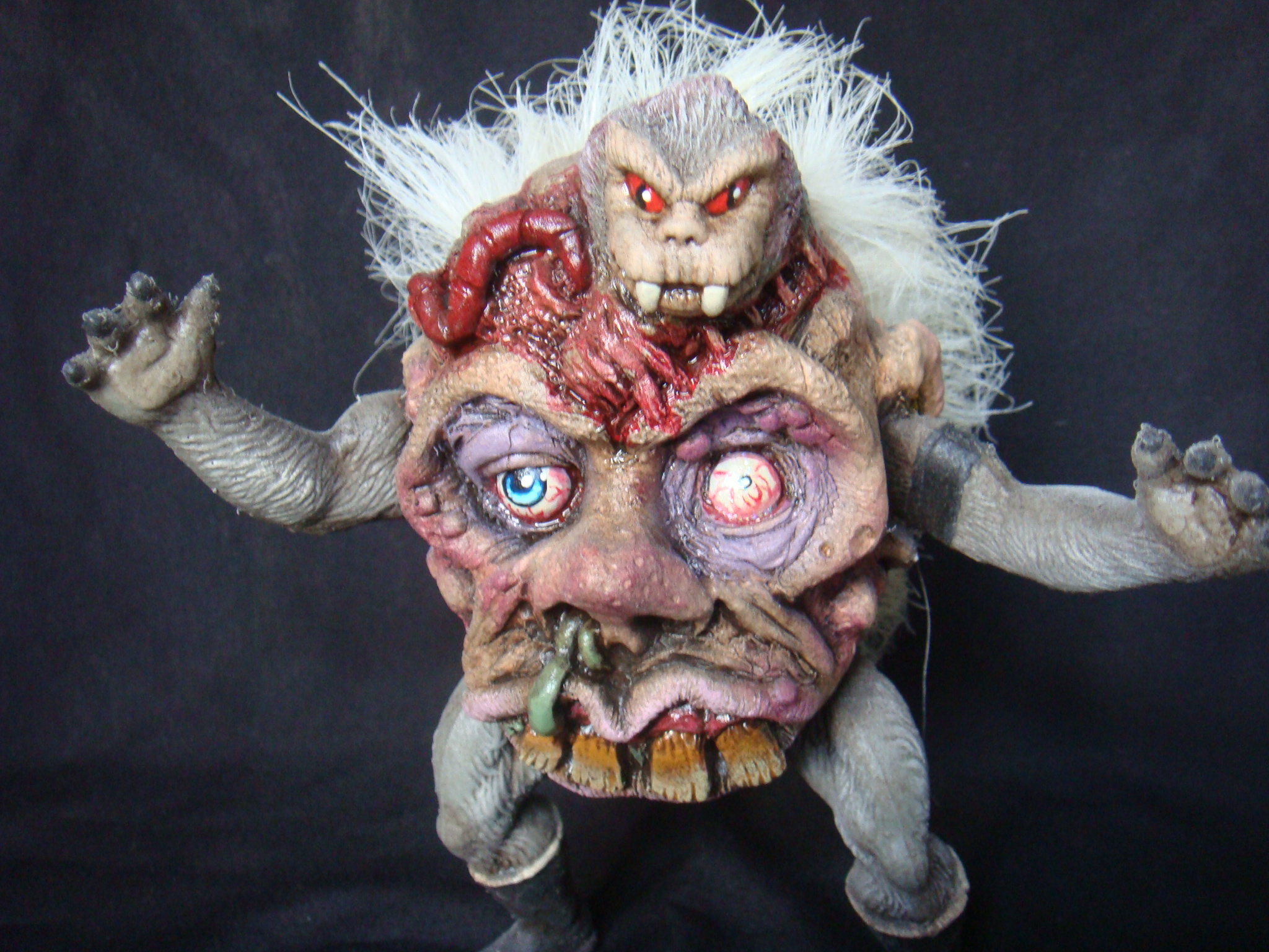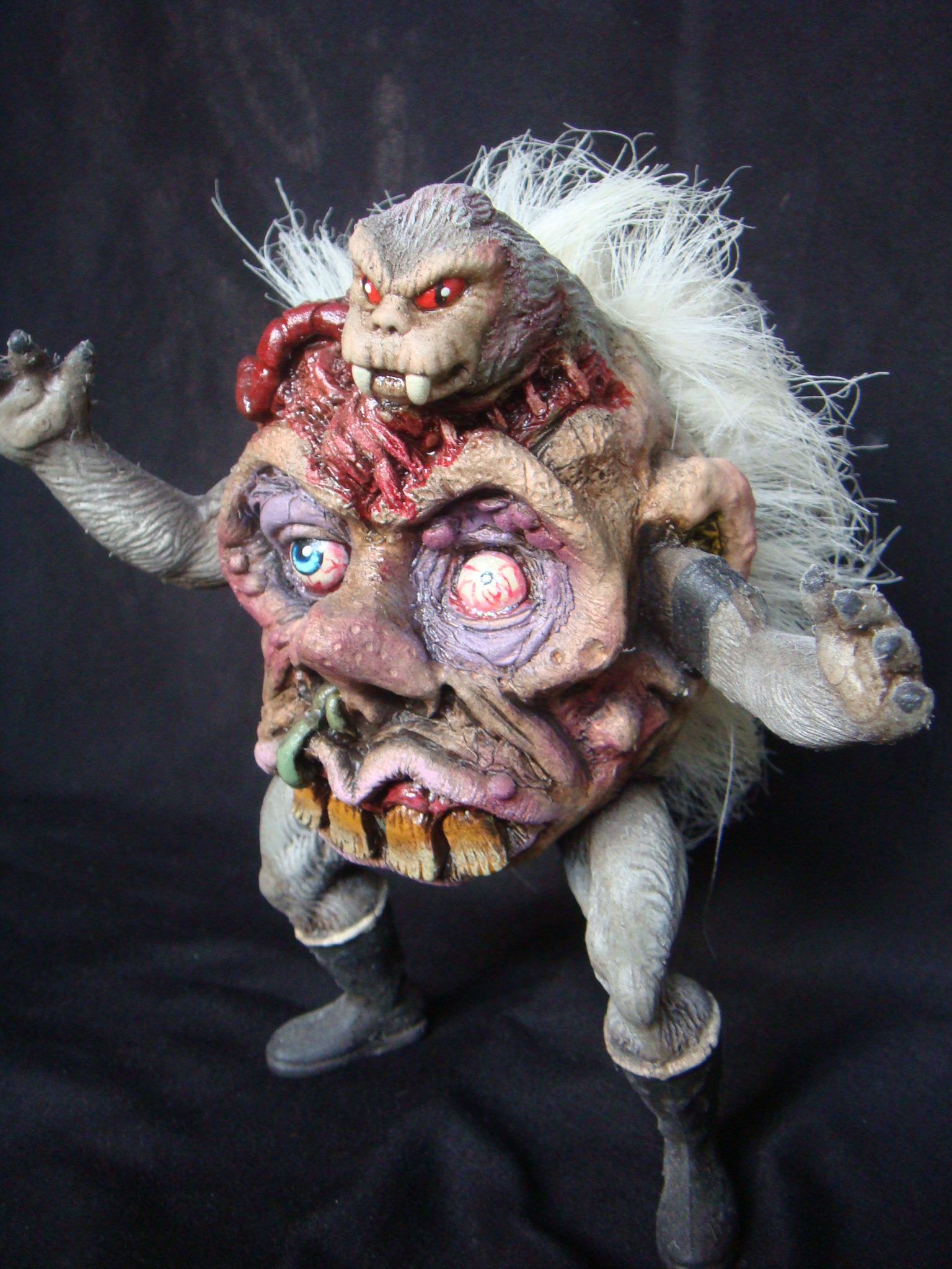This is Grizzle. He is a member of the Evil Head group. He is also one of three or four (possibly five) non articulated resin figures I'll be releasing in my spare time. I'm not one to bootleg or use parts that were sculpted by other artists, but this series is an exception due to the title I've chosen for these guys. This guy is a parody of the He-Man series I used to watch as a child, but he's also a love letter to the He-Man figures and to many other toys and movies that influenced when I was young, so I wanted to use parts from the actual toys. Imagine a Mad Scientist throwing together a creation made from the parts of Madballs or Weird Balls, He-Man action figures, and happy trolls, all while watching California Raisin commercials and an unhealthy amount of zombie movies and other horror films such as John Carpenter's The Thing, Gremlins, and films like Don Dohler's The Alien Factor. This should give you an idea as to where I'm coming from.