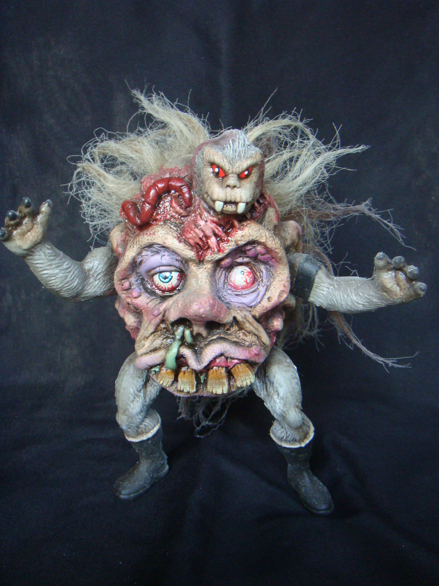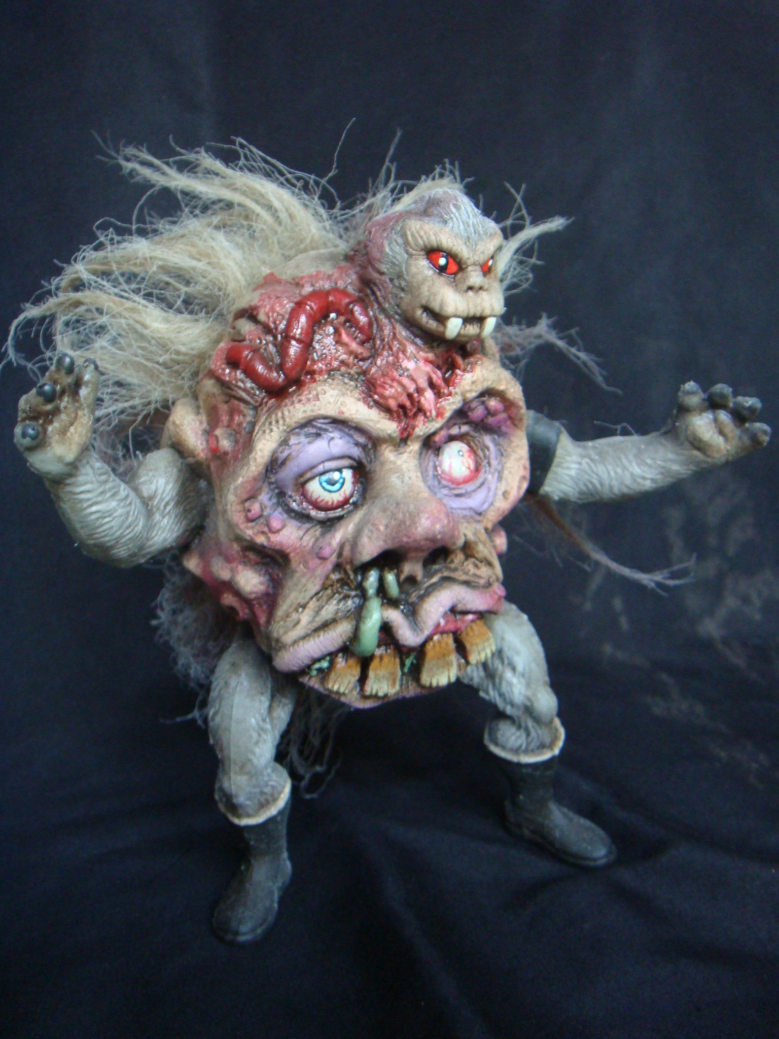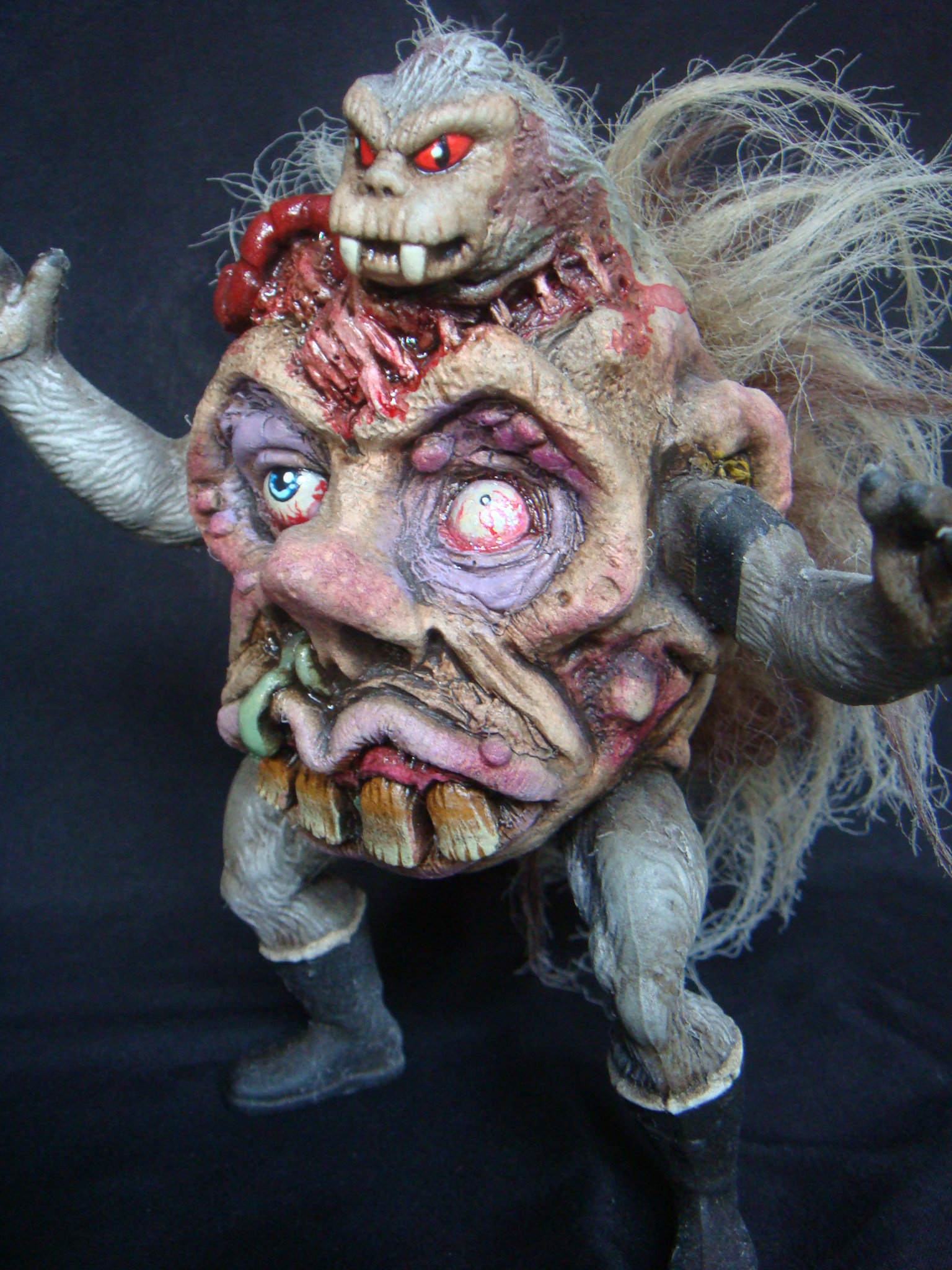 This is Grizzle. He is a member of the Evil Head group. He is also one of three or four (possibly five) non articulated resin figures I'll be releasing in my spare time. I'm not one to bootleg or use parts that were sculpted by other artists, but this series is an exception due to the title I've chosen for these guys. This guy is a parody of the He-Man series I used to watch as a child, but he's also a love letter to the He-Man figures and to many other toys and movies that influenced when I was young, so I wanted to use parts from the actual toys. Imagine a Mad Scientist throwing together a creation made from the parts of Madballs or Weird Balls, He-Man action figures, and happy trolls, all while watching California Raisin commercials and an unhealthy amount of zombie movies and other horror films such as John Carpenter's The Thing, Gremlins, and films like Don Dohler's The Alien Factor. This should give you an idea as to where I'm coming from.